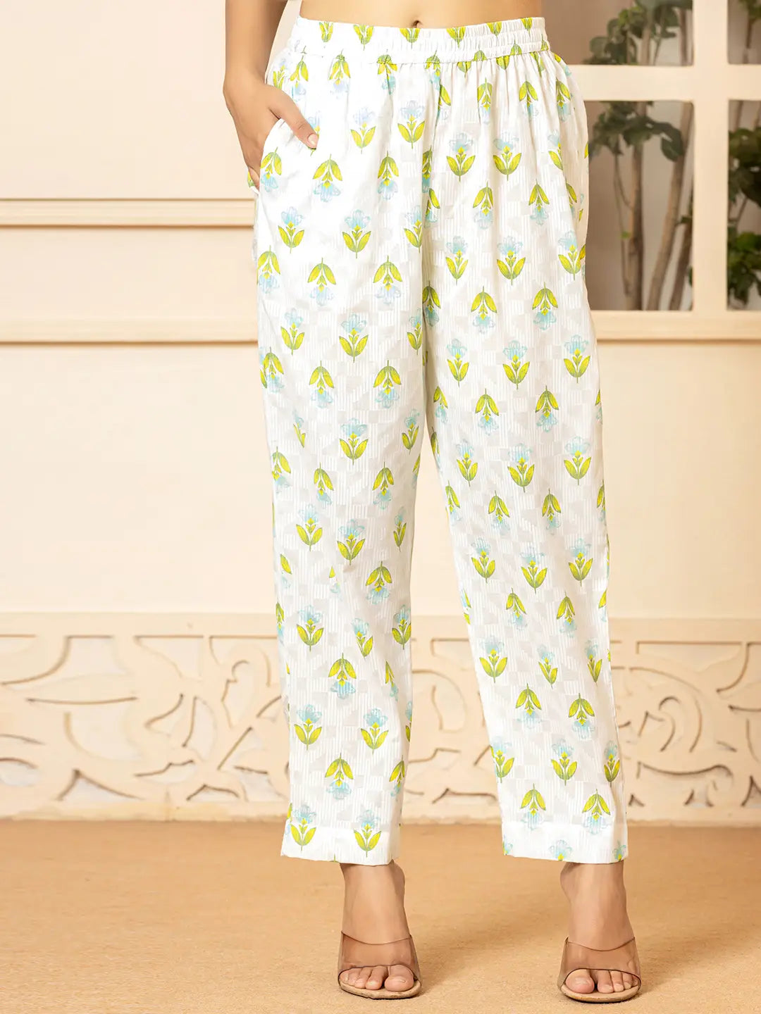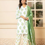 White And Teal Blue Cotton Floral Print Kurta Dupatta Set