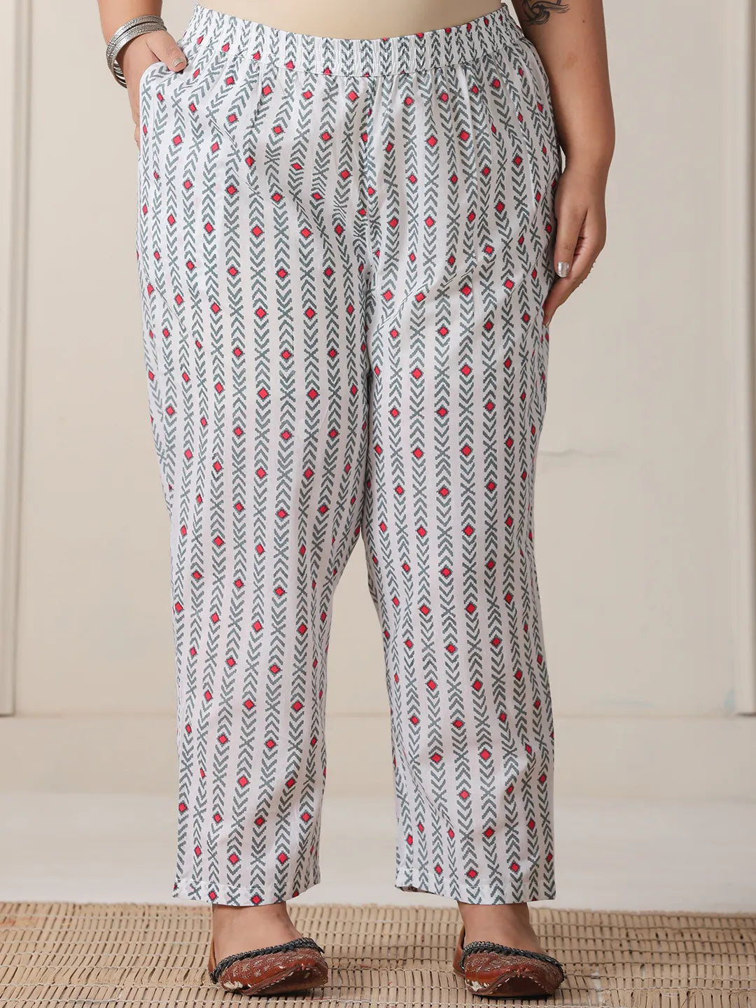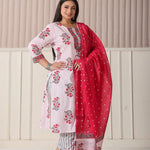 White Floral Print Cotton Sequins Work Plus Size Kurta Set With Pant Dupatta
