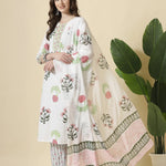 White Floral Print Cotton Show Button On Yoke Kurta Set With Pant & Dupatta