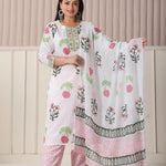 White Floral Print Cotton Show Button On Yoke Plus Size Kurta Set With Pant & Dupatta