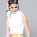 White High Neck Sleeveless Rib Crop Top, in Cotton Rib fabric, Unlined, Crop Length, Comfort Fit, No Closure, Straight Hemline and features High Neck Detail