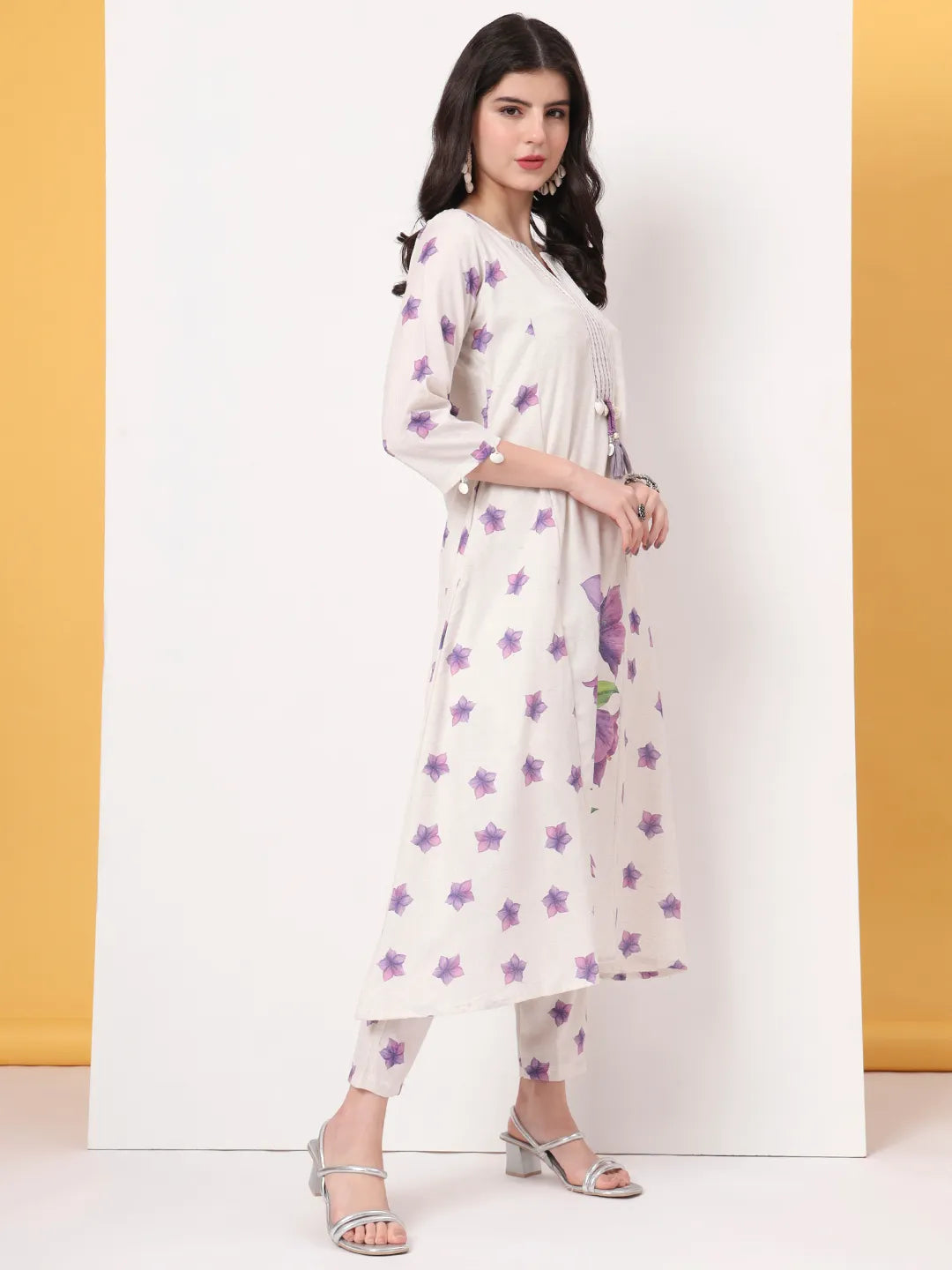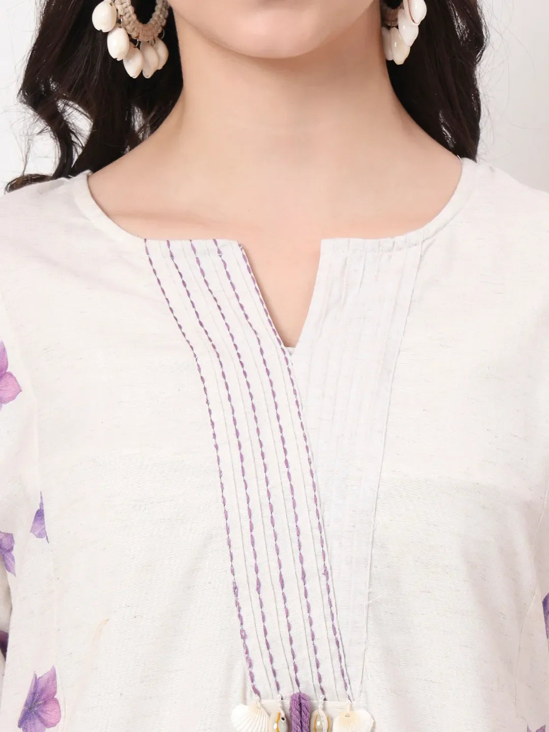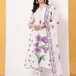 White Floral,Kantha_Work kurta Trouser Dupatta Set, Kurta Design Kantha_Work A-Line Shape Three quarter Regular Sleeves Round-Neck Calf Length Kurta Flared Hem Linen Machine Weave Lining Fabric Cotton Trouser Design:Printed one pocket Pure Cotton Trouser Slip-On Waist Size & Fit Material & Care Linen Dry Clean