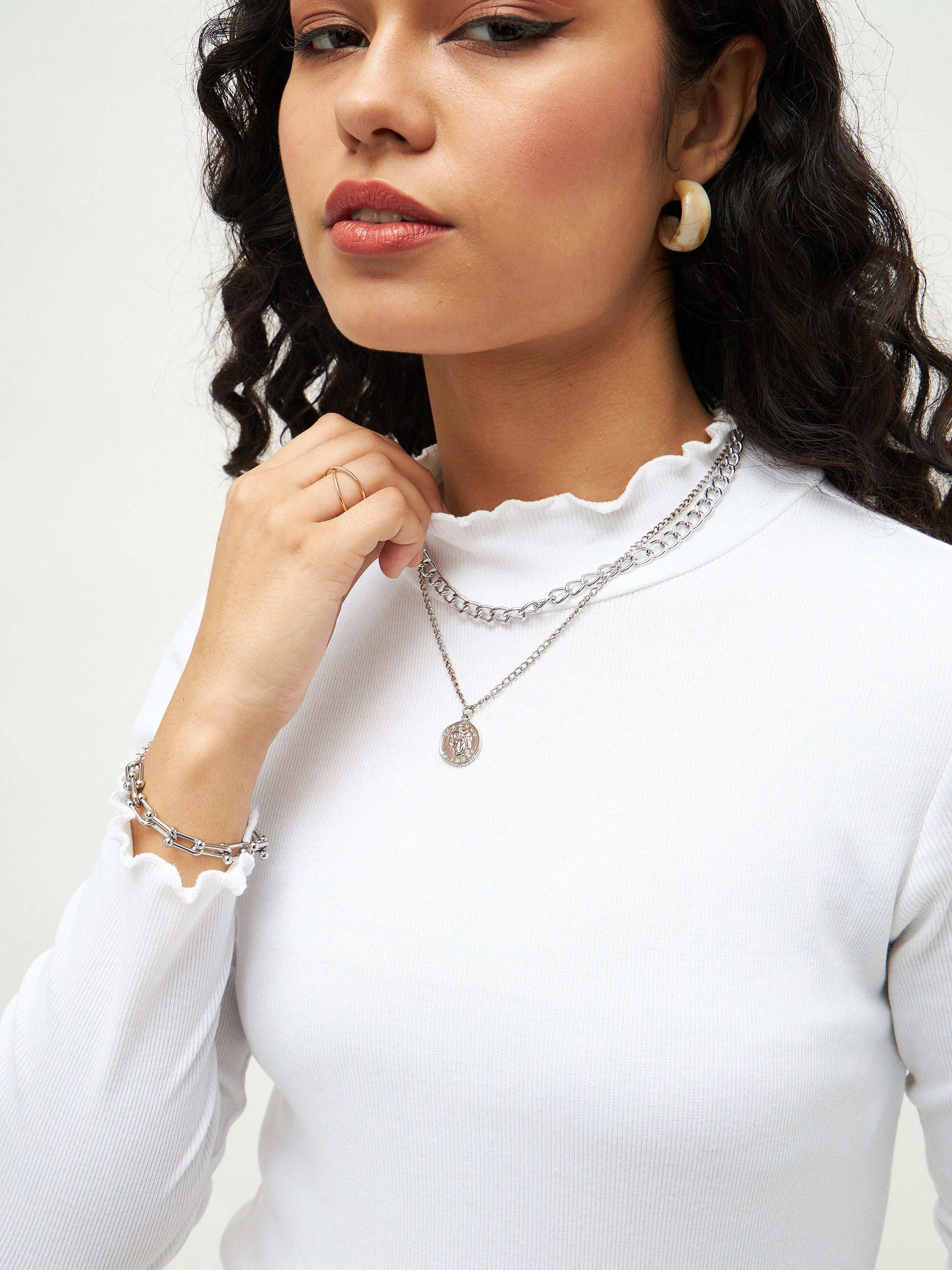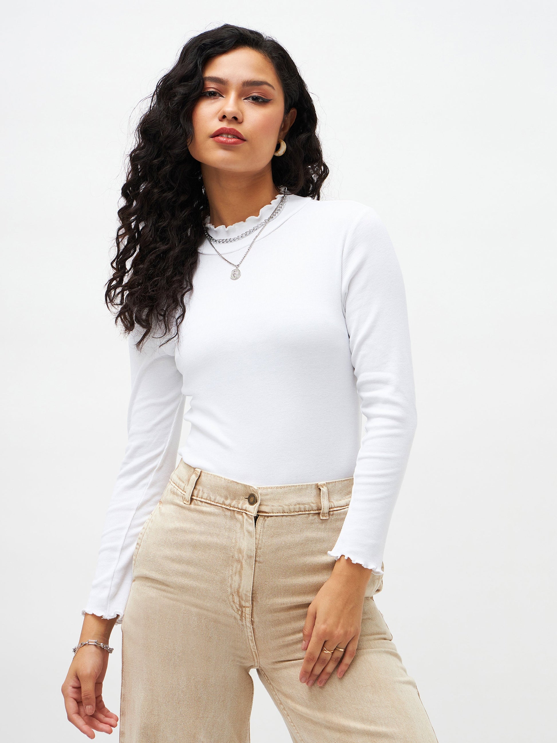 White Rib High Neck Full Sleeve Top , in Cotton Rib fabric, Unlined, Regular Length, Comfort Fit, No Closure, Straight Hemline and features Contrast Thread Detail