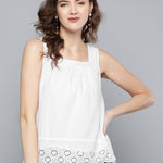 White Square Neck Schiffli Blouse , in Cotton fabric, Unlined, Regular Length, Comfort Fit, No Closure, Straight Hemline and features Embroidery Detail At Hem