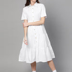 White Tiered Shirt Dress, in Poplin fabric, Poly Knit Lining, Midi Length, Comfort Fit, Button Closure, Flared Hemline and features Tier at Skirt