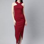 Wine Halter Maxi, in Polyester Spandex fabric, Unlined, Ankle Length, Slim Fit, Zipper Closure, Asymmetric Hemline and features Halter neckline