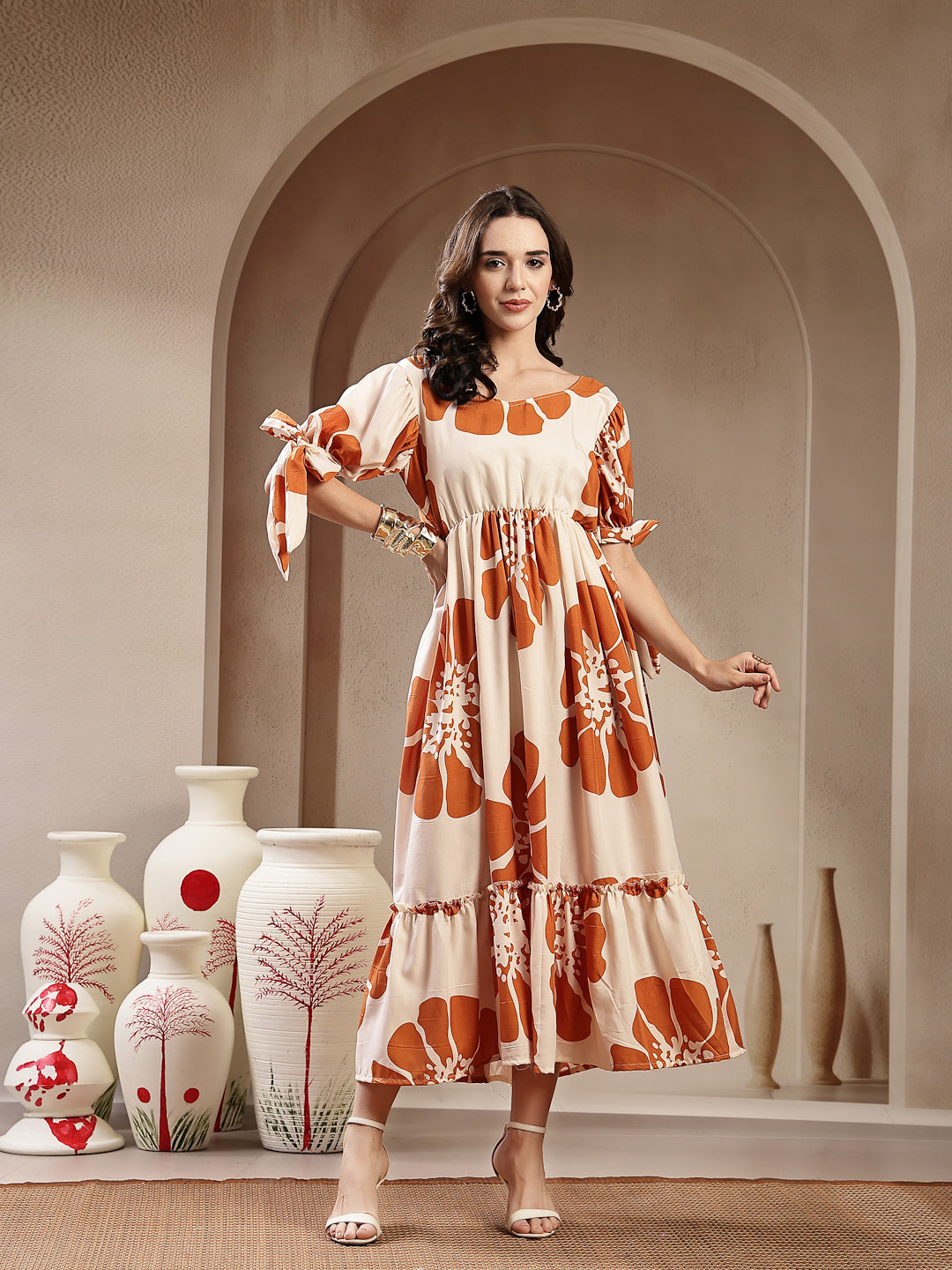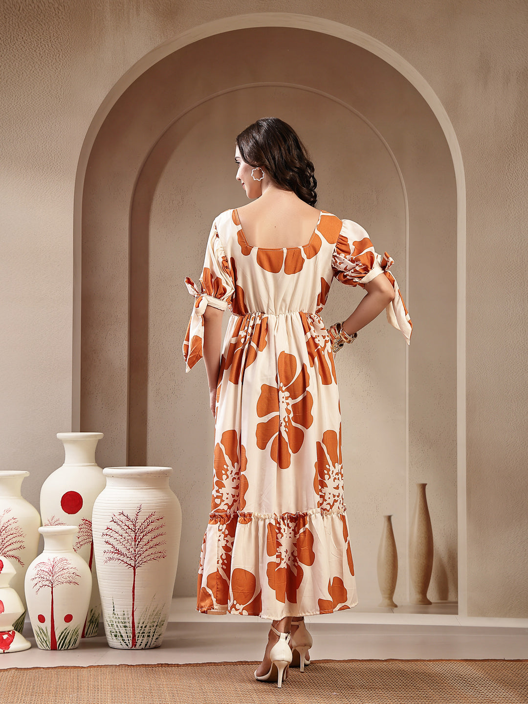 Brown Floral Printed Rayon Tiered Dress (Pre-Order)