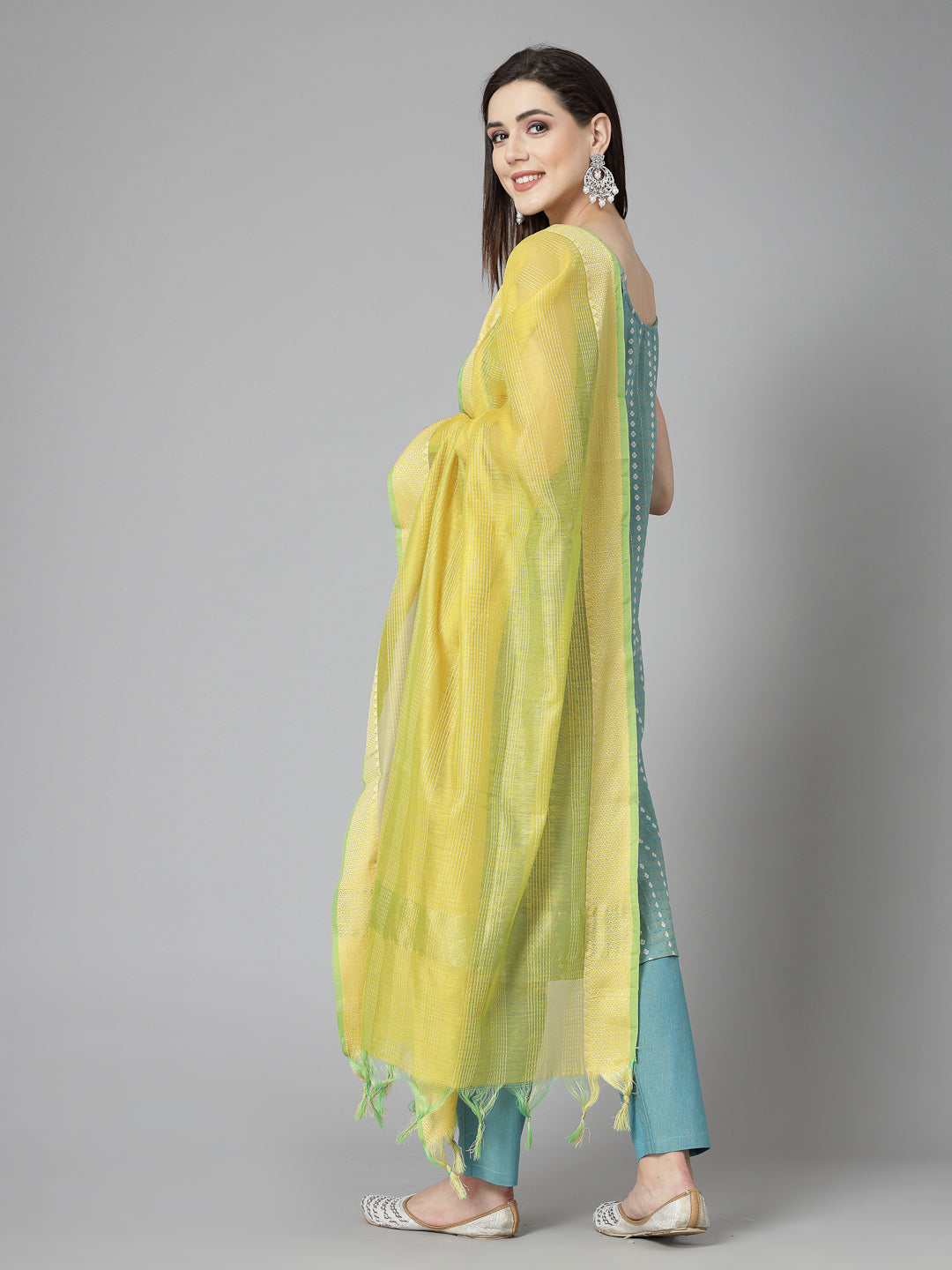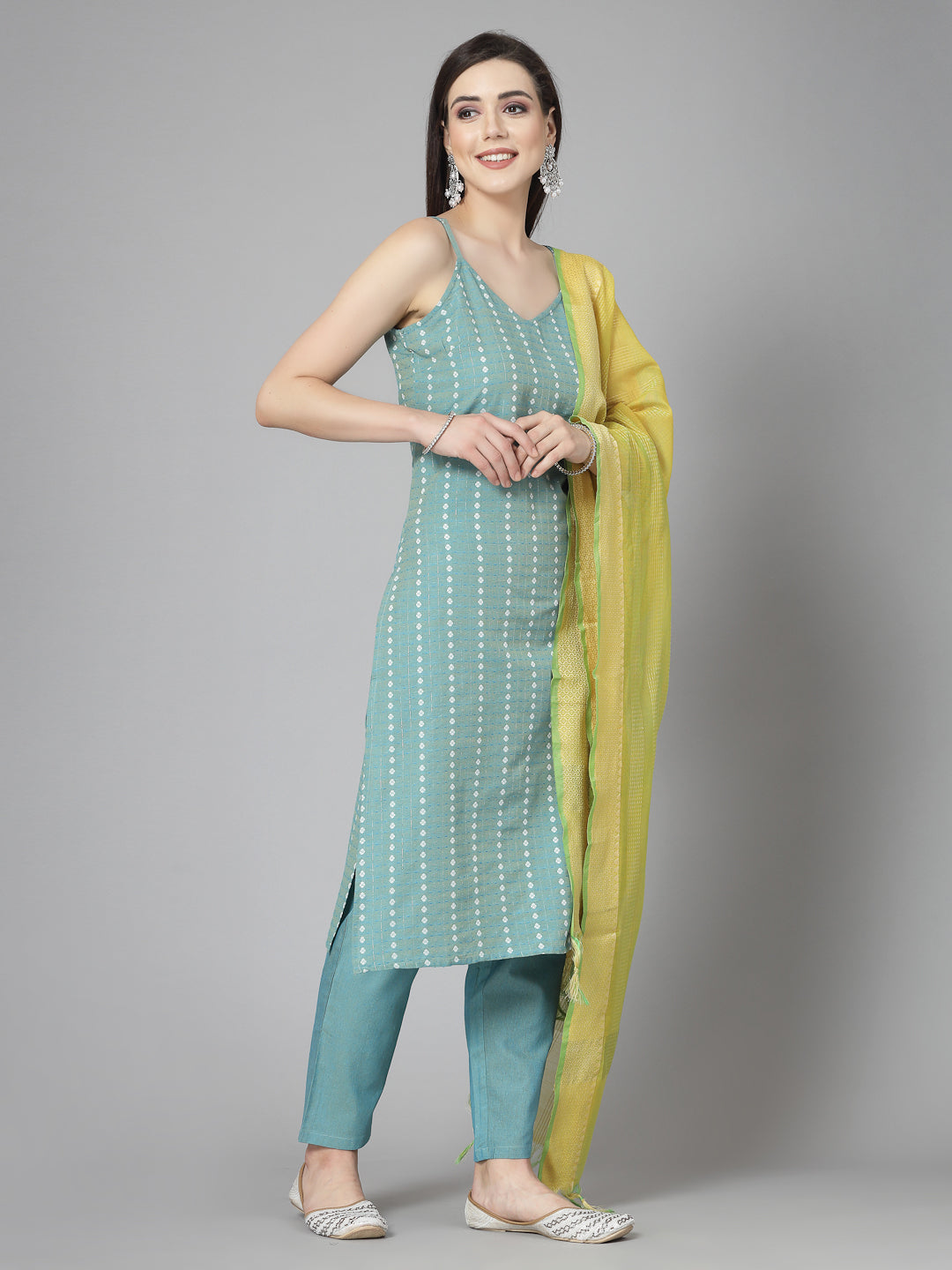 Woven Designed Cotton Blend Straight Kurta Pant Dupatta Set (Pre-Order)