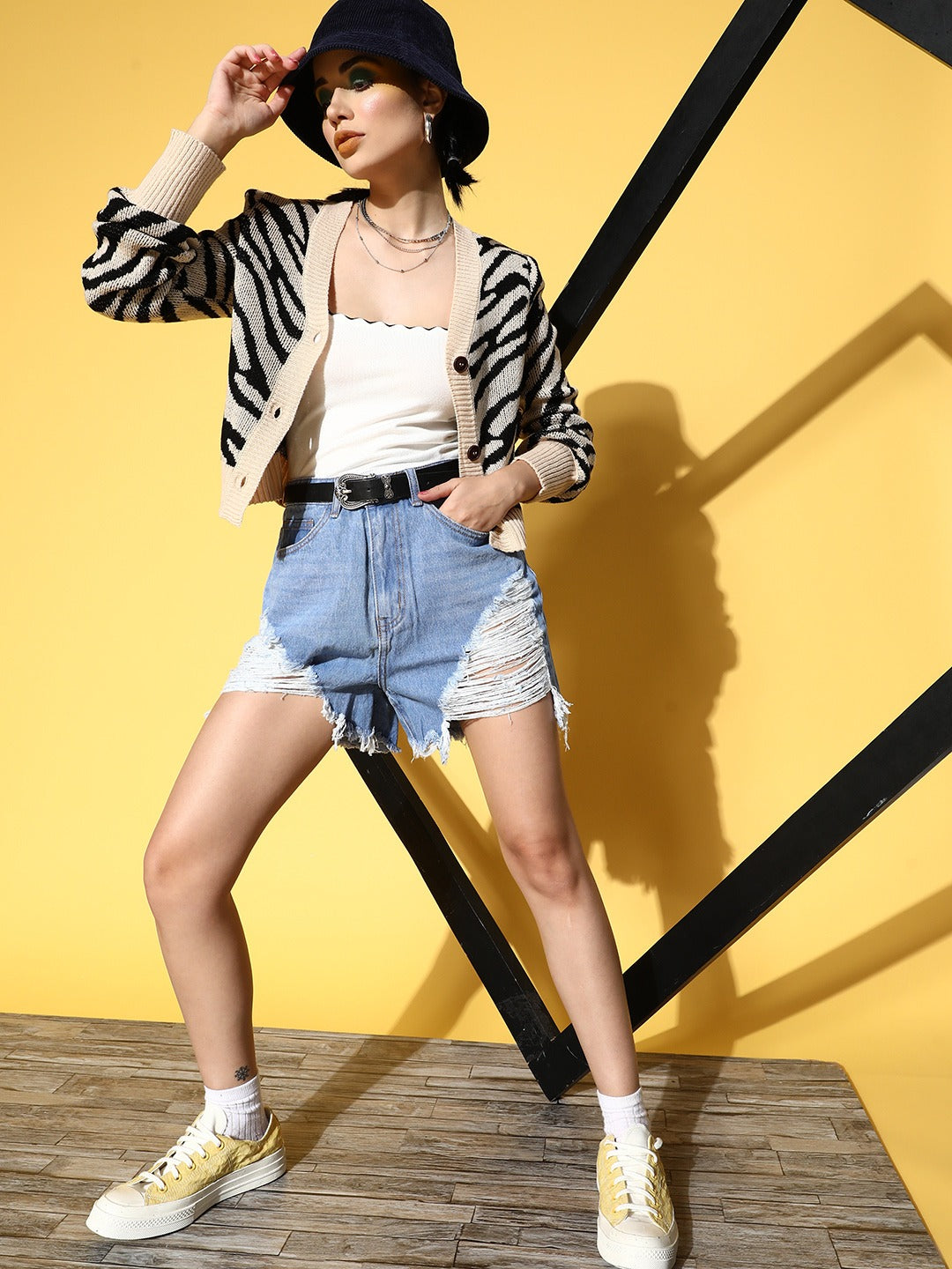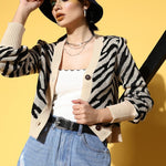 Beige Animal Print Front Open Wool Cardigan, in Acrylic fabric, Unlined, Crop Length, Comfort Fit, Button Closure, Straight Hemline and features V Neck Detail