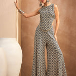 Beige & Black Floral Sleeveless Top With Palazzos, in Rayon fabric, Cotton Voile Lining, Regular Length , Fit & Flare , Zipper Closure, Straight Hemline and features Zipper Detail At Back