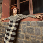 Beige Check Woolen Sweater Dress, in Nylon fabric, Unlined, Above Knee, Bodycon, No Closure, Straight Hemline and features All Over Self Design