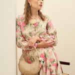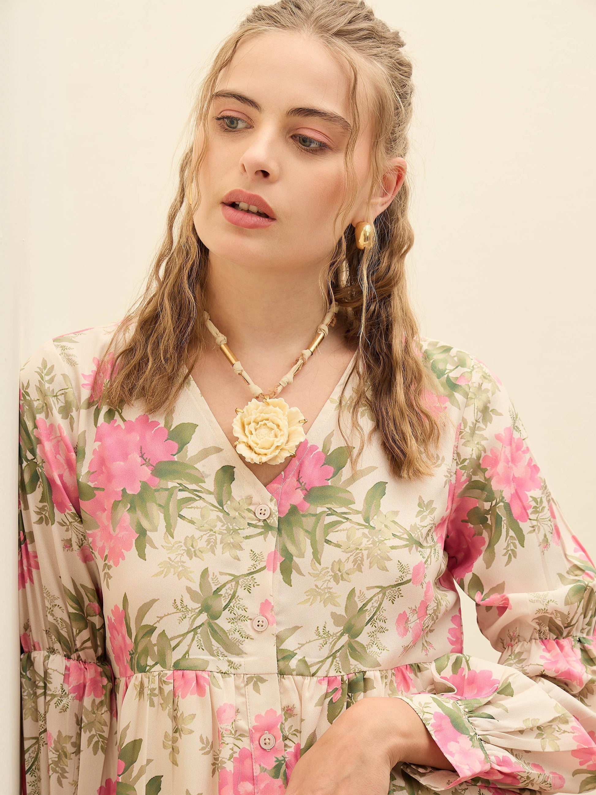 Beige Floral Ruffle Hem V-Neck Short Dress, in Summercool fabric, Polyknit Lining, Above Knee, Loose Fit, Button Closure, Flared Hemline and features Ruffle Detail At Hem