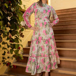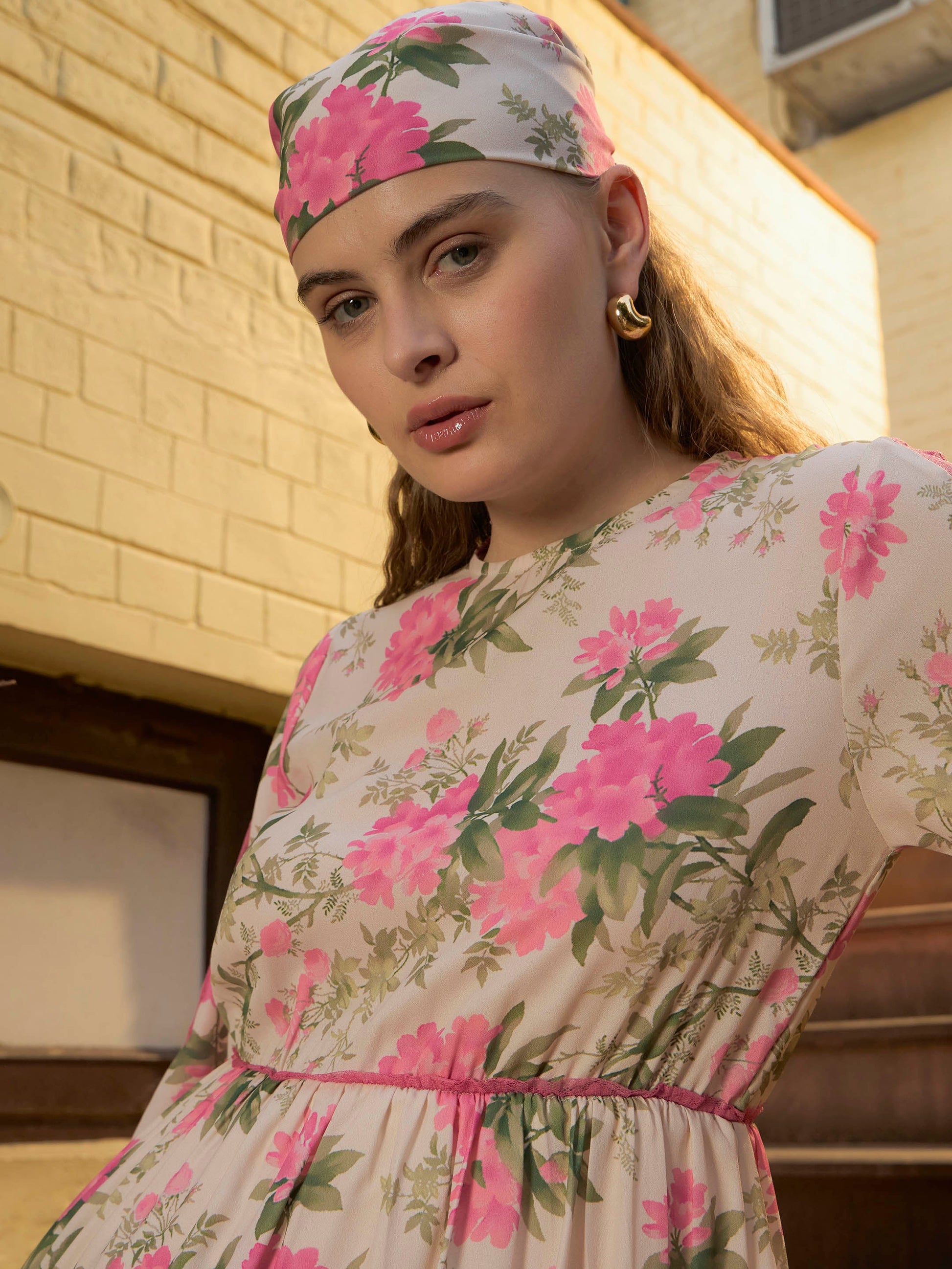 Beige Floral Tiered Maxi Dress, in Summercool fabric, Polyknit Lining, Below Knee, Fit & Flare, Button Closure, Flared Hemline and features Lace Detail At Sleeves