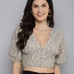 Beige Lace Puff Sleeve Crop Top , in Lace fabric, Poly Knit Lining, Crop Length, Comfort Fit, Button Closure, Straight Hemline and features Button Detail At Front