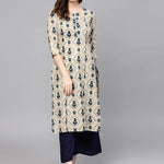 Beige & Navy Blue Printed Pure Cotton Kurta