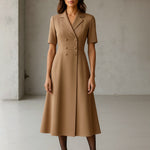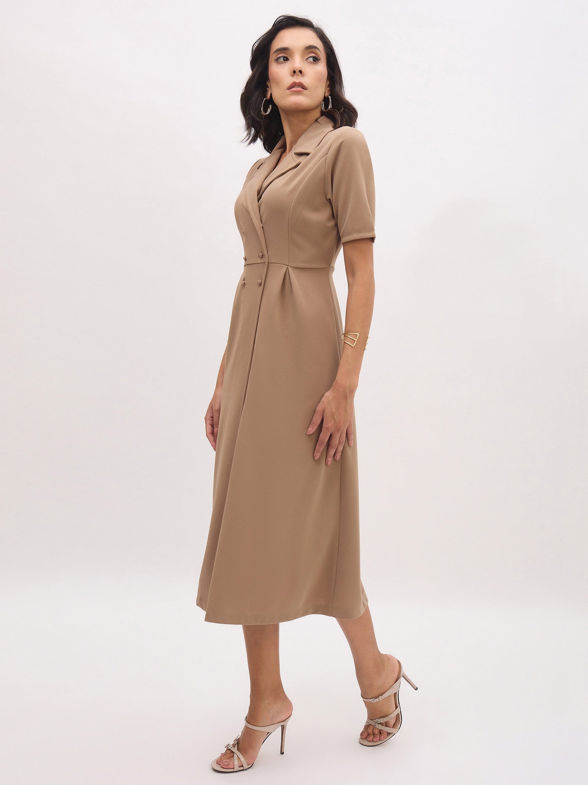 Beige Notch Collar Button Midi Dress, in Canton fabric, Unlined, Midi Length, Comfort Fit, Button Closure, Flared Hemline and features Button Detail