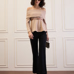 Beige Off-Shoulder Belted Peplum Top, in Flat Back Winter Rib fabric, Unlined, Regular Length, Comfort Fit, No Closure, Flared Hemline and features PU belt Detail At Waist