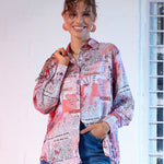 Beige Pink Newspaper Print Satin Shirt, in Satin fabric, Unlined, Regular Length, Comfort Fit, Button Closure, Straight Hemline and features Self fabric Pig Nose Buttons