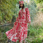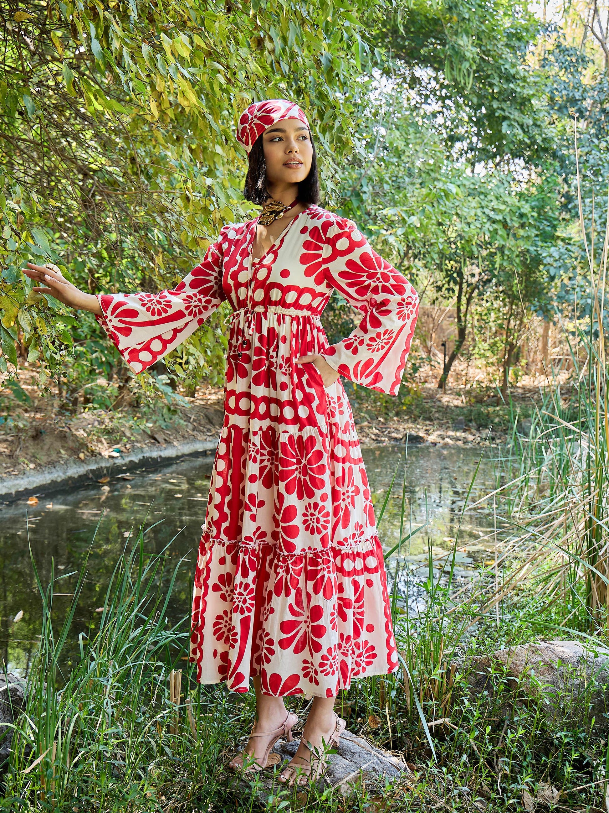 Beige & Red Floral V Neck Waist Tie Knot Midi Dress, in Cotton Cambric fabric, Cotton Voile, Midi Length , Fit & Flare, Drawstring Closure, Flared Hemline and features Front Knot Detail At Waist