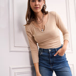 Beige Rib Drop V-Neck Top, in Rib fabric, Unlined, Regular Length, Slim Fit, No Closure, Straight Hemline and features Ribbed Fabric