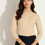 Beige Rib High Neck Full Sleeve Top , in Rib fabric, Unlined, Regular Length, Slim Fit, No Closure, Straight Hemline and features Baby Overlock Detail At Neck