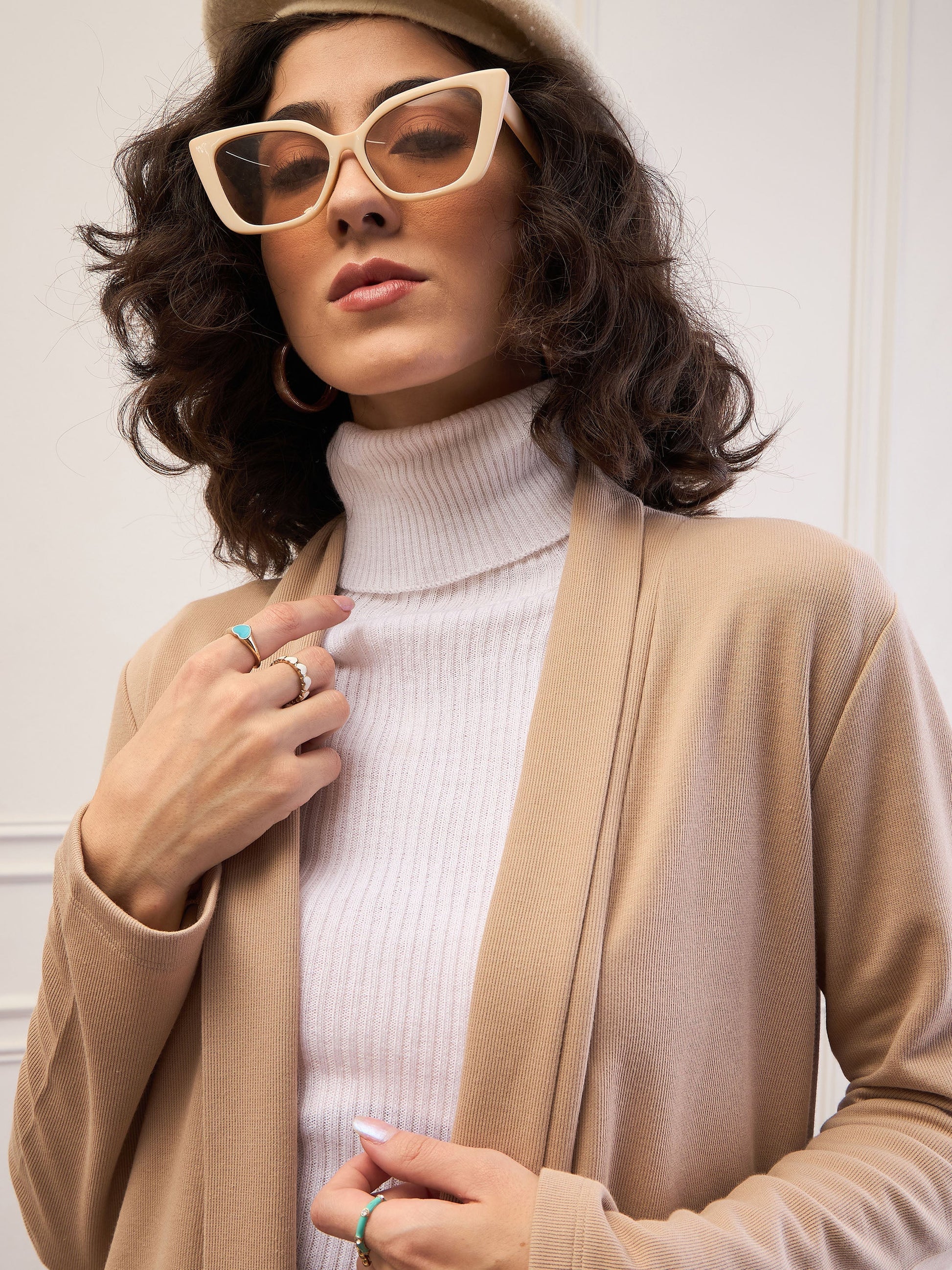 Women Beige Rib Longline Shrug