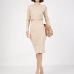 Beige Rib Side Cut-Out Midi Dress, in Rib fabric, Unlined, Below Knee, Slim Fit, No Closure, Straight Hemline and features Side Cut Out At Waist Detail