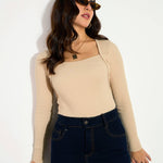 Beige Rib Square Neck Full Sleeves Top, in Rib fabric, Unlined, Regular Length, Slim Fit, No Closure, Straight Hemline and features Self Ribbed Design