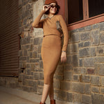Beige Rib Sweater With Pencil Skirt, in Viscose Nylon Rib fabric, Unlined, Regular Length, Slim Fit, No Closure, Straight Hemline and features Self Ribbed Design