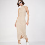 Women Beige Rib Turtle Neck Sleeveless Midi Dress