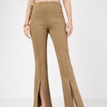 Beige Roma Front Slit Bell Bottom Pants, in Roma fabric, Unlined, Full Length, Slim Fit, Slip On, Straight Hemline and features Multi Color Embroidery on Top & Bottom