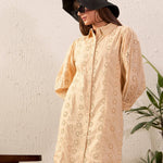 Beige Schiffli Shirt Dress, in Cotton Schiffli fabric, Cotton Voile, Above Knee, Comfort Fit, Button Closure, Straight Hemline and features Gather Detail on Sleeves