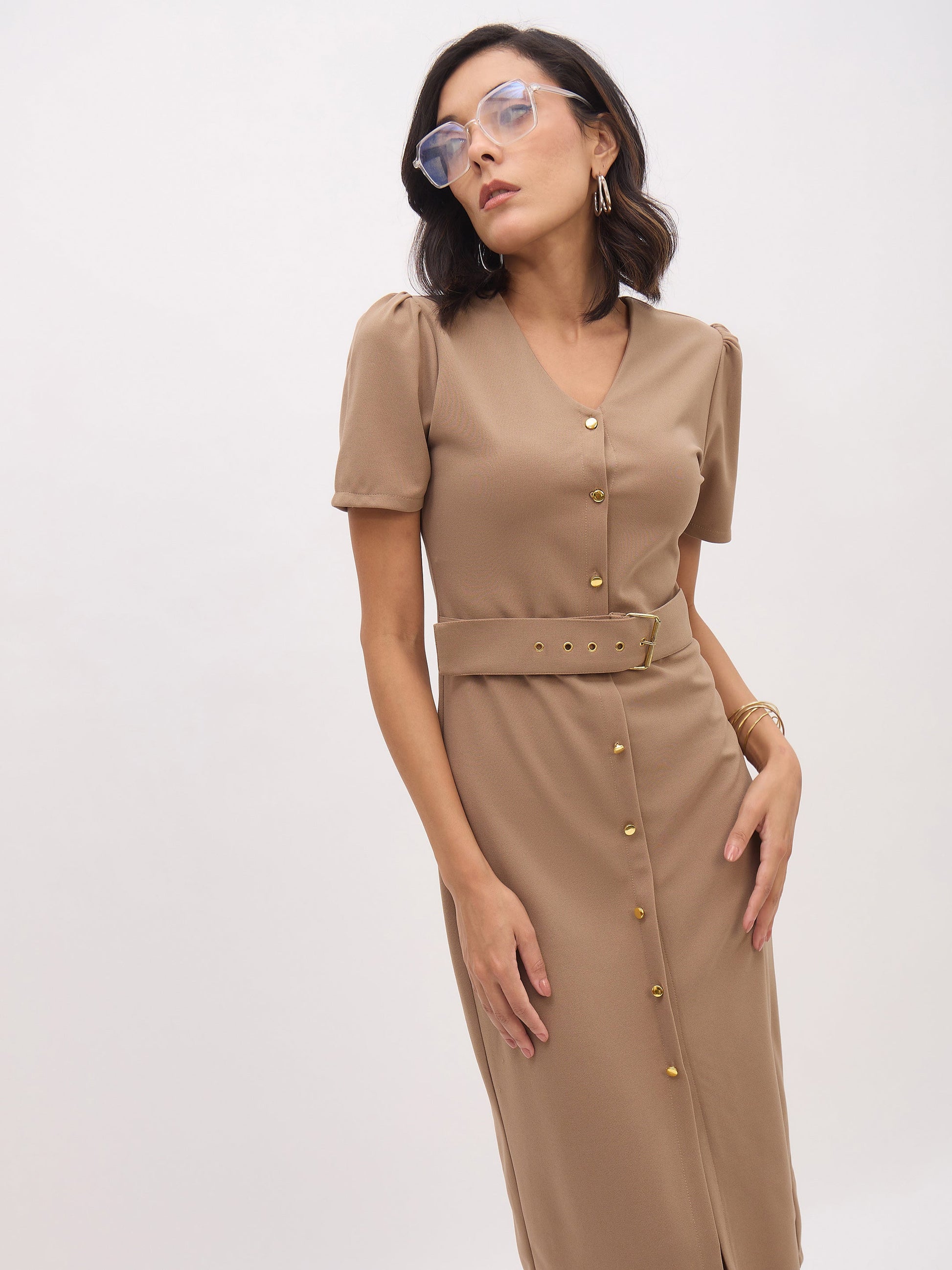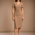 Beige V Neck Button Belt Midi dress, in Canton fabric, Unlined, Midi Length, Bodycon, Button Closure, Straight Hemline and features Belt Detail