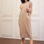 Beige V-Neck Sweater Dress, in Flat Back Winter Rib fabric, Unlined, Below Knee, Comfort Fit, No Closure, Straight Hemline and features Rib At Botoom