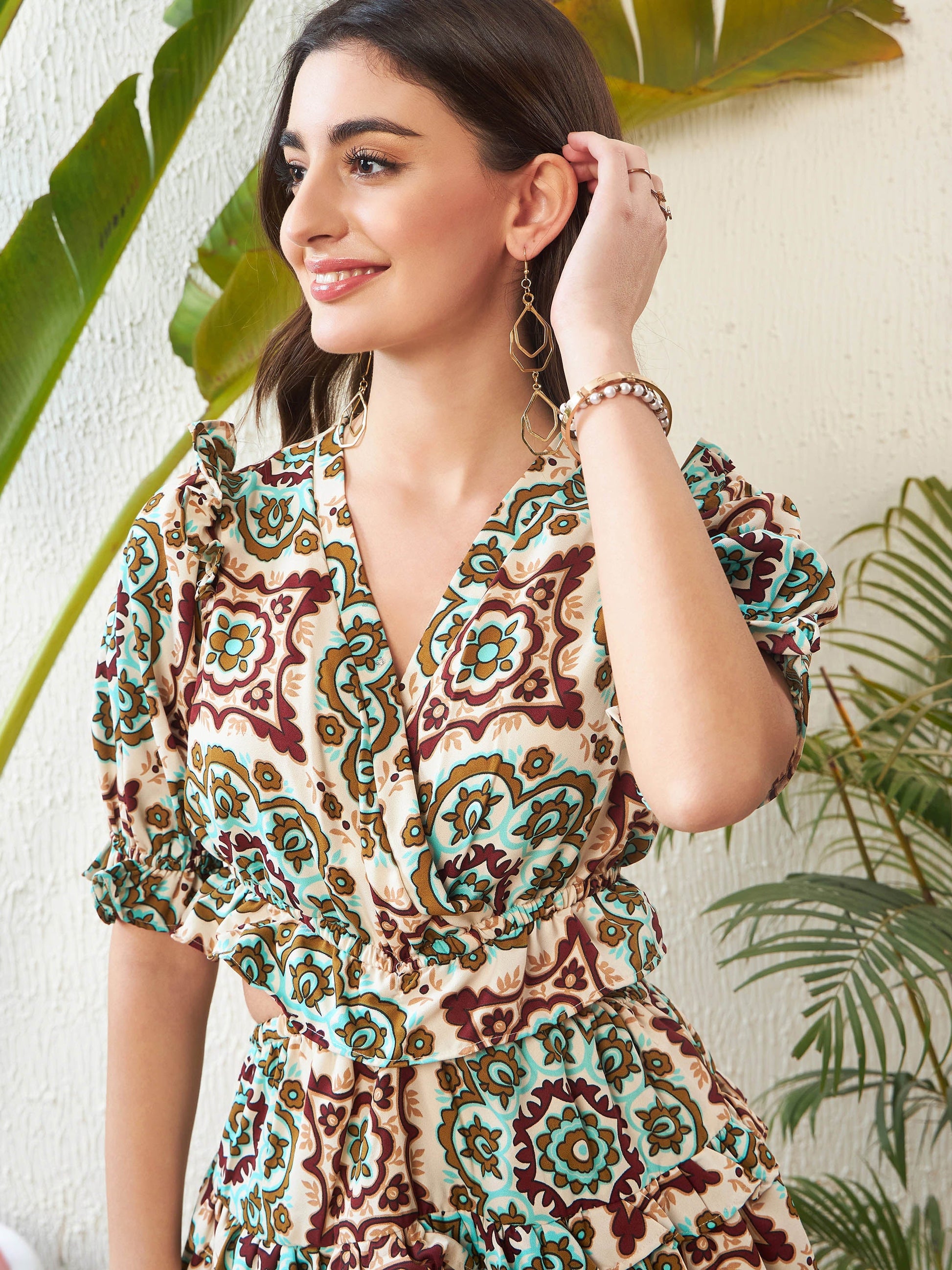 Women Biege Ethnic Motif Waist Cut-Out Tiered Dress