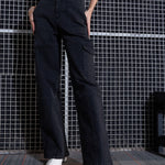 Black Acid Wash Contrast Stitch Cargo Straight Jeans, in Denim fabric, Casual , Full Length, Button Closure, Unlined , Flap Pocket Detail At Sides Hemline and features 6 Pockets