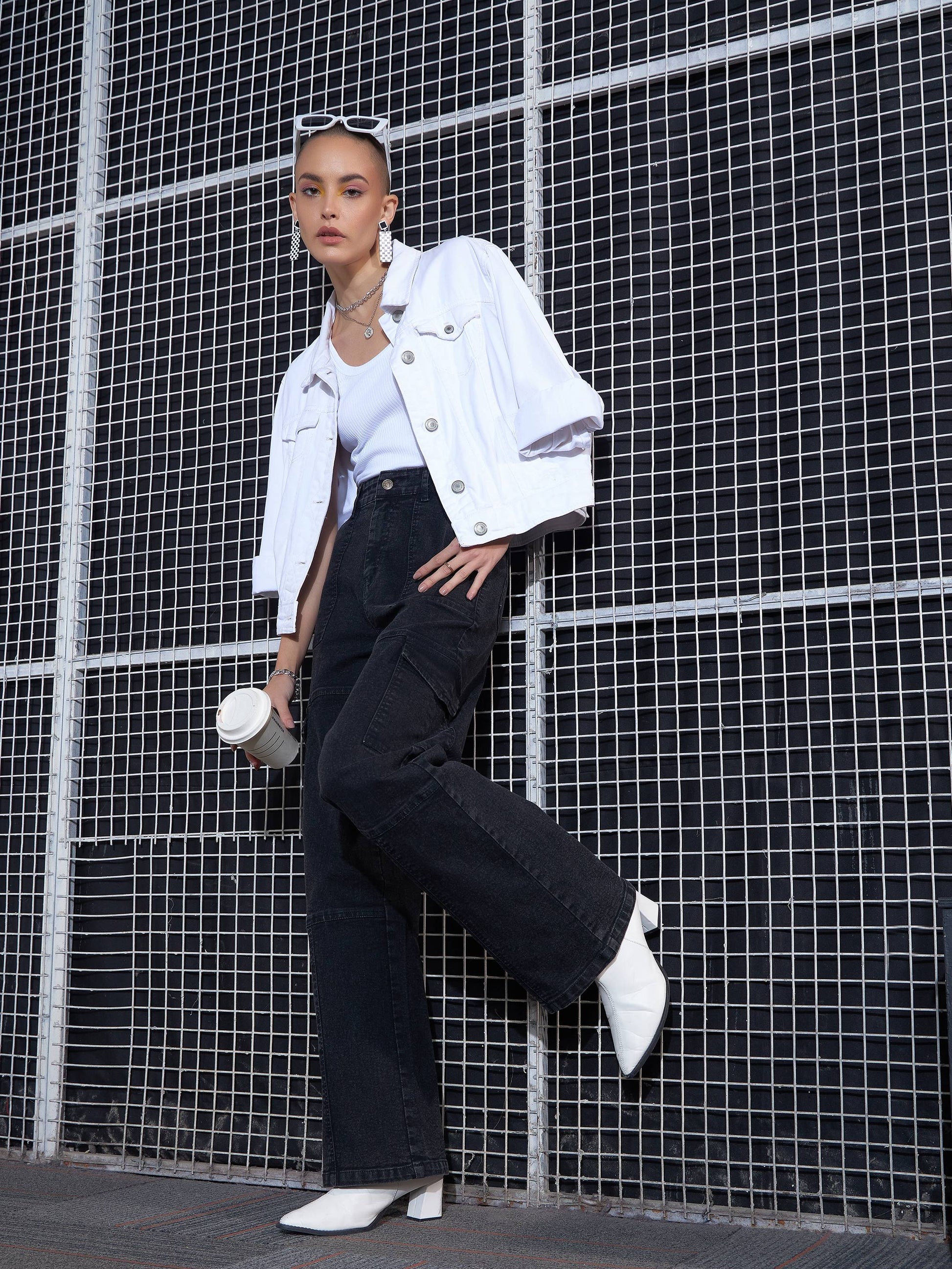 Women Black Acid Wash Contrast Stitch Cargo Straight Jeans
