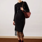 Black Acrylic Wool Hem Frindge Detail Midi Dress, in Acrylic Wool fabric, Unlined, Midi Length , Bodycon Fit, No Closure, Straight Hemline and features Frindge Detail At Hem