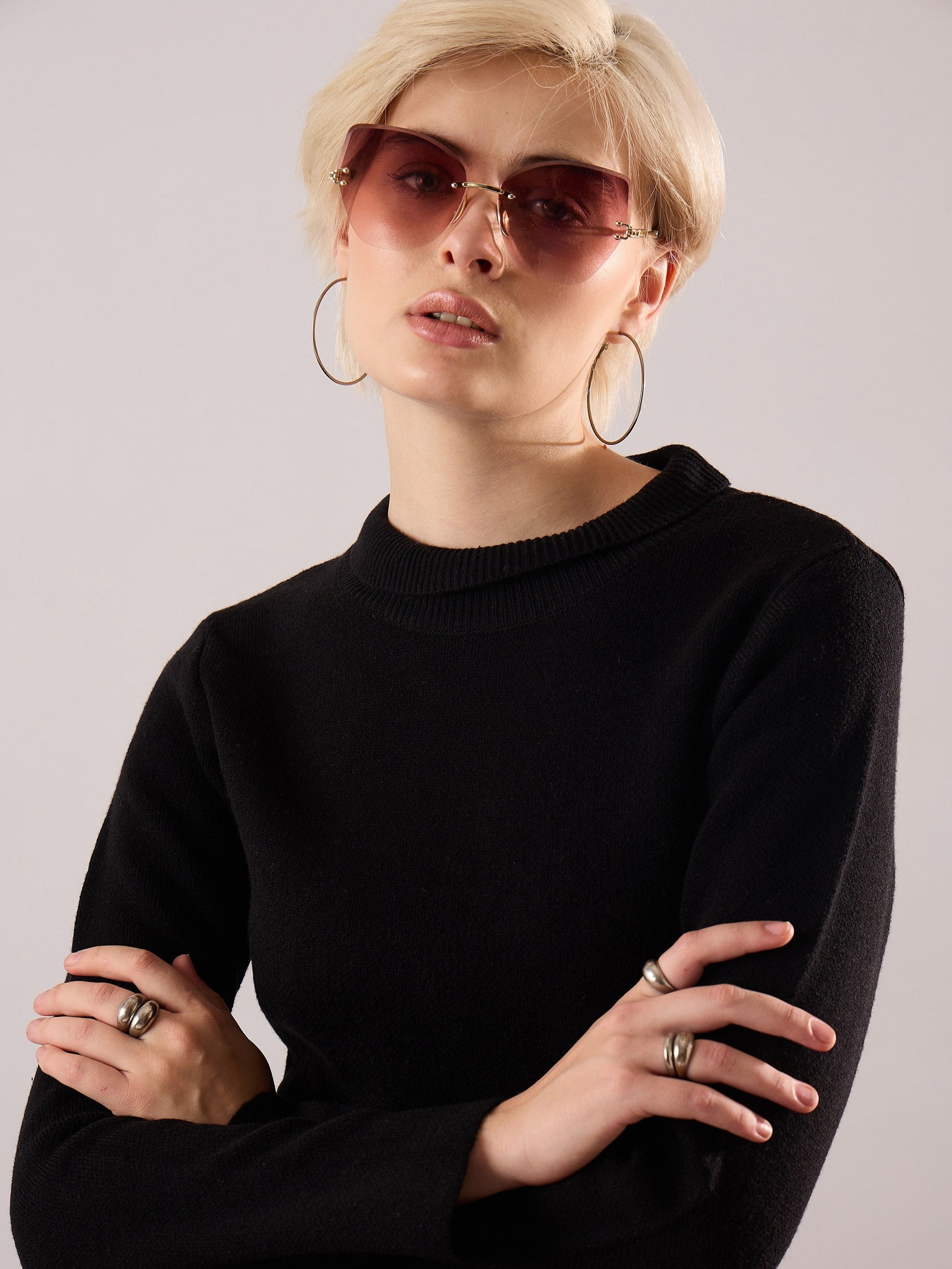 Women Black Acrylic Wool Hem Frindge Detail Midi Dress