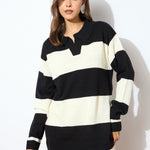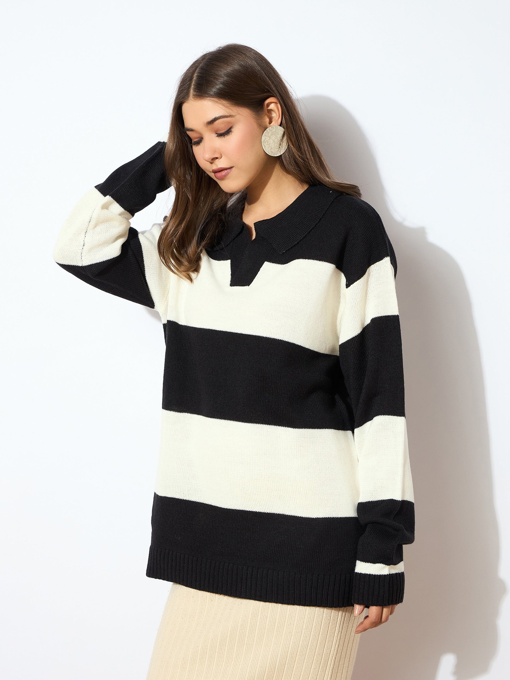 Black And White Polo Neck Sweater , in Acrylic fabric, Unlined, Regular Length, Comfort Fit, No Closure, Straight Hemline and features Horizontal Stripe Detail