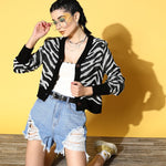 Black Animal Print Front Open Wool Cardigan, in Acrylic fabric, Unlined, Crop Length, Comfort Fit, Button Closure, Straight Hemline and features V Neck Detail