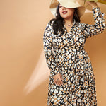 Black & Beige Printed Wrap Dress, in Poly Moss fabric, Unlined, Above Knee, Comfort Fit, Zipper Closure, Straight Hemline and features Wrap Detail At Front
