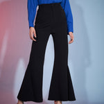 Black Bell Bottom Kick Pleats Knitted Pants, in Karera Knit fabric, Unlined, Full Length, Slim Fit, Button Closure, Straight Hemline and features Kick Pleats Detail At Bottom