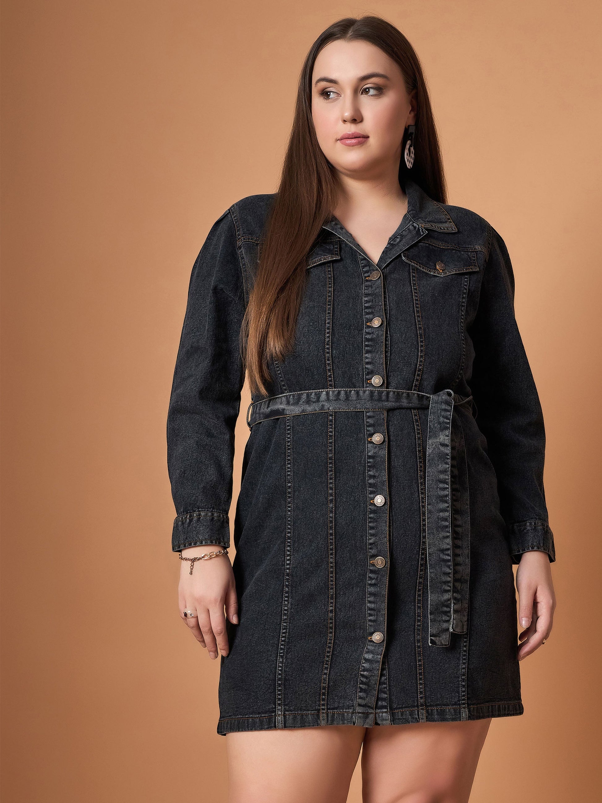 Black Blast Denim Front Button Shirt Dress, in Denim fabric, Unlined , Above Knee, Straight Fit, Button Closure , Straight Hemline and features Belt Detail At Front