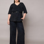 Black Blast Denim Peplum Top With Jeans, in Denim Lycra fabric, Unlined, Regular Length, Comfort Fit, Zipper Closure, Flared Hemline and features PU Belt Detail