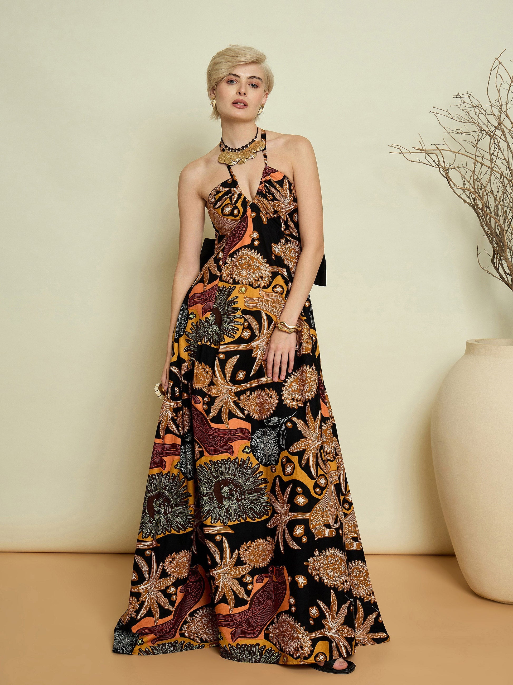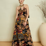 Women Black Boho Printed Back Bow Strappy Maxi Dress