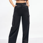Black Box Pockets Straight Pants, in Cotton Twill fabric, Unlined, Full Length, Comfort Fit, Button Closure, Straight Hemline and features Box Pockets On Sides