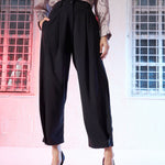 Black Button Hem Darted Balloon Pants, in Canton Knit fabric, Unlined, Full Length, Balloon Fit, Button Closure, Straight Hemline and features Pleats At Front