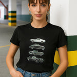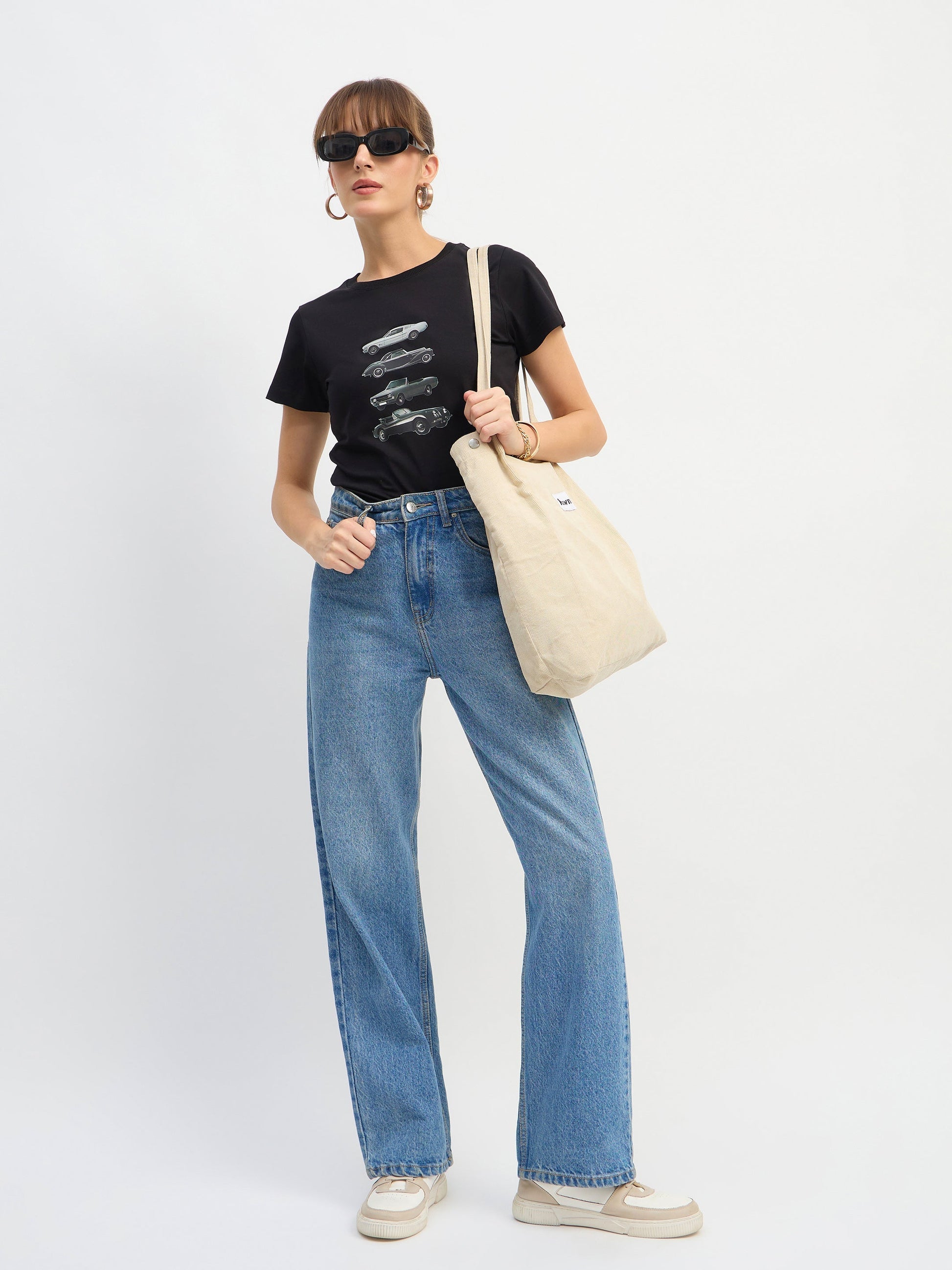 Black CAR Print Lycra T-Shirt, in Cotton Jersey fabric, Unlined, Crop Length, Slim Fit, NA, Straight Hemline and features Rib At Neck