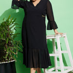 Black Chain Detail Wrap Dress, in Georgette fabric, Polyester Lining, Below Knee, Fit & Flared, Zipper Closure, Straight Hemline and features Metal Chain Detail At Front
